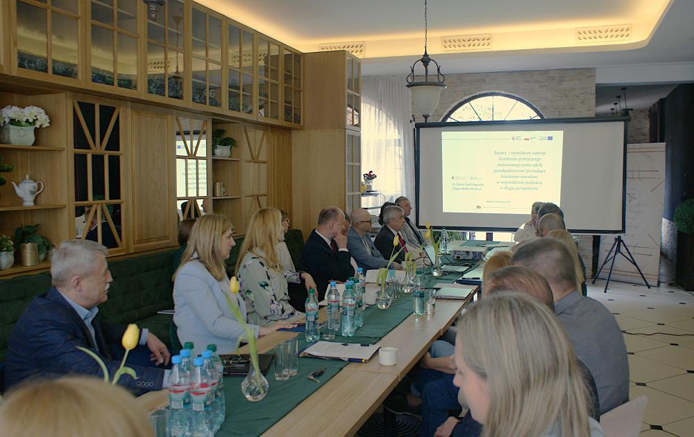 W drugiej części spotkania uczestnicy mogli zapoznać się z wynikami opracowania pt. „Bariery i stymulatory rozwoju kształcenia praktycznego realizowanego przez szkoły ponadpodstawowe prowadzące kształcenie zawodowe w województwie podlaskim w długiej perspektywie”. Wyniki badania, a także wypływające z niego wnioski oraz rekomendacje przedstawił dr Łukasz Bugowski z Uniwersytetu w Białymstoku. Niedopasowanie tempa zmian kształcenia praktycznego do tempa zmian w życiu społeczno-gospodarczym, w tym rozbieżność czasowa między potrzebami rynku pracy i przemysłu a możliwością wykształcenia osób o wymaganych kwalifikacjach, wysoki stopień zbiurokratyzowania procesu wprowadzania zmian w systemie kształcenia praktycznego; niskie zainteresowanie pracodawców współpracą ze szkołami ponadpodstawowymi prowadzącymi kształcenie praktyczne; niski poziom świadomości ludzi młodych (uczniów) i rodziców w zakresie zawodów przyszłości; podejmowanie błędnych decyzji edukacyjnych i doboru odpowiedniego zawodu to tylko część z wniosków z przeprowadzonego badania. Z całością opracowania będzie można zapoznać się na naszej stronie internetowej już wkrótce.